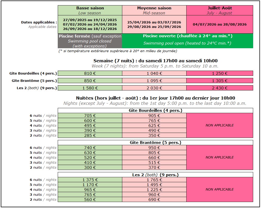 NB : ils n’incluent pas la taxe de séjour qui sera à régler en sus sur place